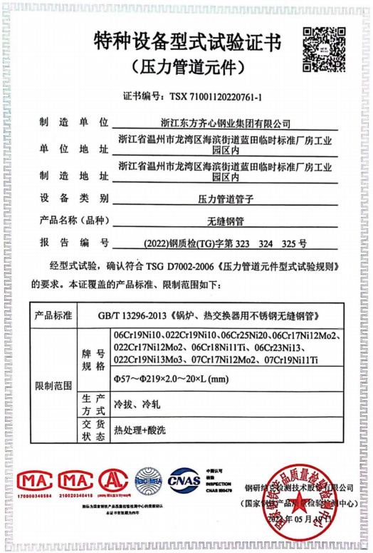浙江東方齊心以不銹鋼系列產品為主導,品種有不銹鋼管、奧氏體不銹鋼管、高溫合金鋼管、雙相不銹鋼管、鎳基合金管、冷凝器用管、U形管、核電管、不銹鋼管件、法蘭、閥門等。規格有6-2020x0.8-60mm,Ф16-25長度可達33m。公司擁有精密制造鋼管的各類機械設備25臺(套),其中各類冷軋管機15臺, 冷拔機10臺,天然氣熱處理爐2套。